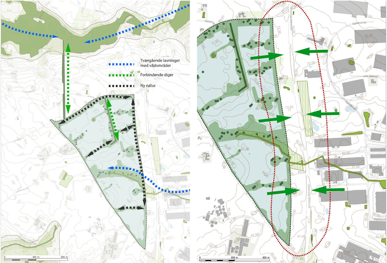 Erhvervsområdets bebyggelse underlægger sig og drager nytte af landskabets fortælling med de karakteristiske træk både i form af lavninger og diger, og et potentiale for en mere sammenhængende natur opstår. Planområdet kan med fordel understøtte, at naturtyper og andre biotoper i erhvervsområdet bindes sammen, så der ikke skabes yderligere barrierer, men at spredningsmulighederne for dyr og planter derimod forbedres.