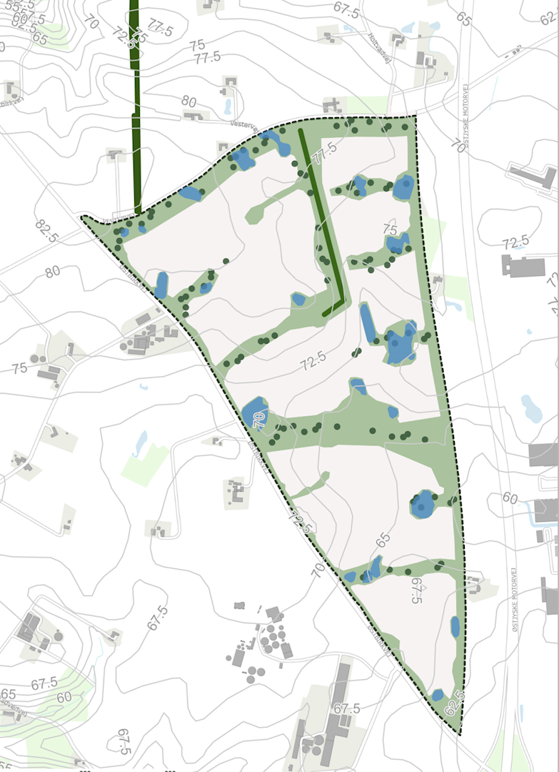 Planområdet kan med fordel drage nytte af det eksisterende lokale naturindhold, som får gode vækstbetingelser i det fremtidige naturlige landskab, hvor vandet lægger sig i områdets lavninger og følger områdets strømningsveje.