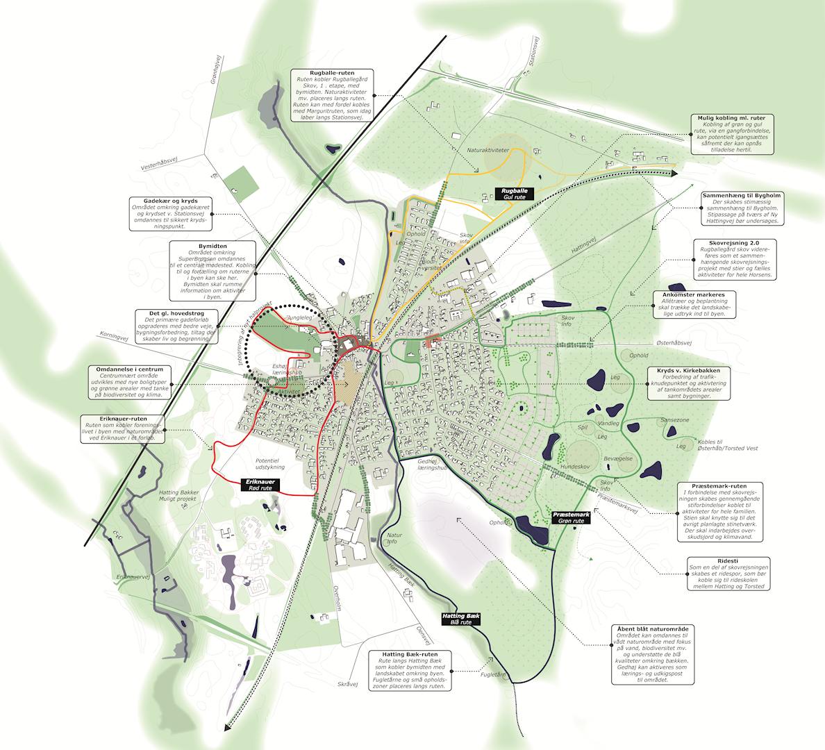 Helhedsplanen for Hatting rummer en samlet værktøjskasse med virkemidler og ønsker fra borgerne, såvel om Horsens Kommune. Tilsammen giver helhedsplanen et fælles ståsted for den fremtidige udvikling af Hatting. På nedenstående illustration har vi samlet alle de gode intentioner i ét. Her illustreres overordnet, hvor der kan sættes ind, og der gives samtidig eksempler på, hvad der kan ske de forskellige steder.