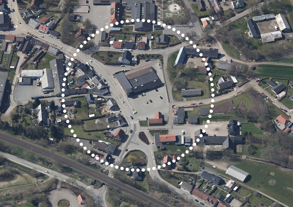 En aktiv bymidte - området dækker over SuperBrugsens areal inkl. parkeringspladsen og bagarealerne, gadekæret og ankomsterne via de omkringliggende veje.