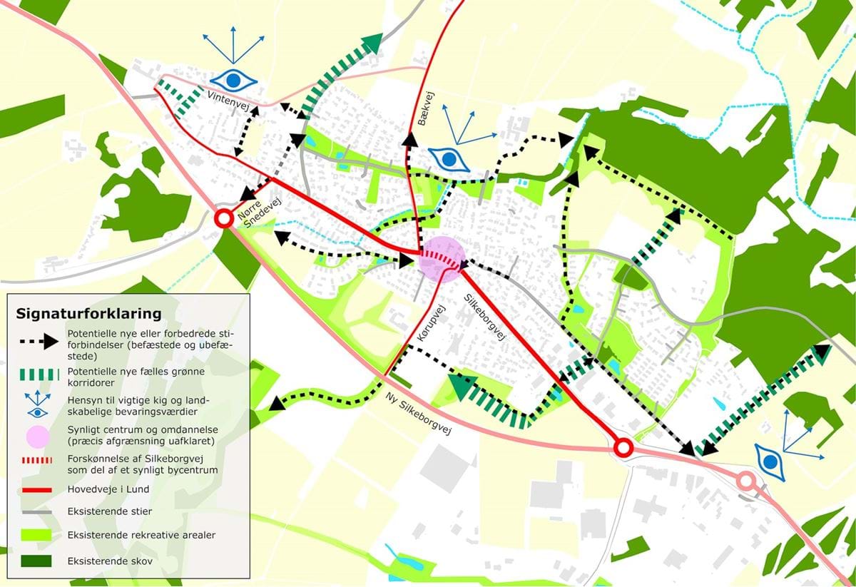 Ovenfor er de strategiske hensyn i den fremtidige fysiske planlægning illustreret, heriblandt byens landskabsværdier, stier og rekreative, grønne forbindelser samt et klarere defineret bycentrum. Nedenfor er de syv udvalgte strategier beskrevet i uprioriteret rækkefølge: