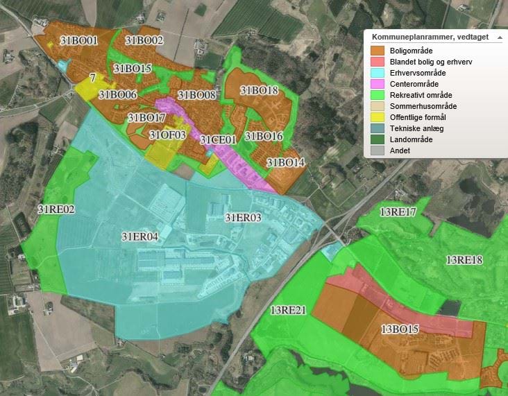Oversigtskort over de kommuneplanlagte bolig-, erhvervs- og centerområder samt offentlige og rekreative områder. Illustration mangler færdigredigering