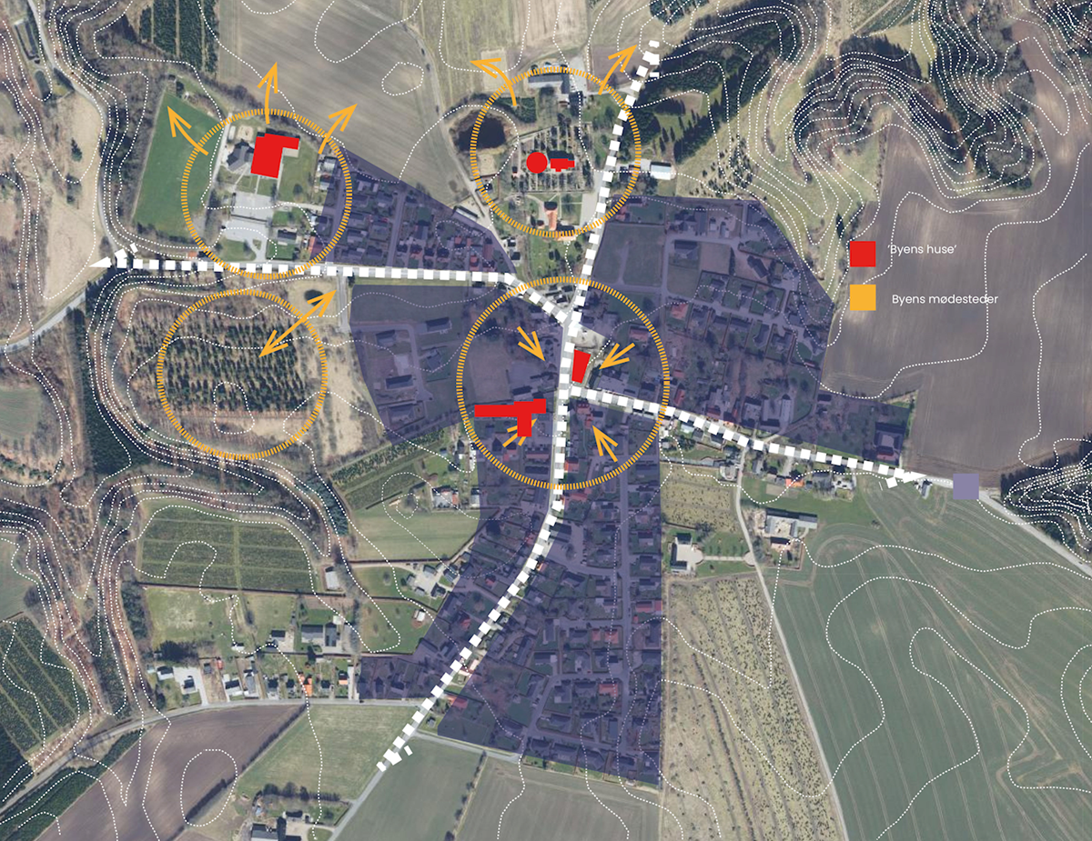 Kort over strategien for Sønder Vissing. Stategien omfatter 4 indsatser: Dronning Toves By, Naturbyen, Fællesskabets by og Den trafiksikre by.