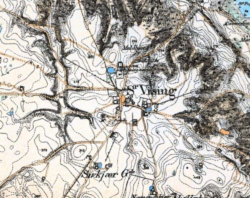 Herover: Gamle kort fra 1873 og 1909. Man kan se de gamle gårde, den oprindelige skole, smedien og den tidligere præstegård, som brændte ned. Vejstrukturen er genkendelig fra i dag. Højdeangivelser i fod.