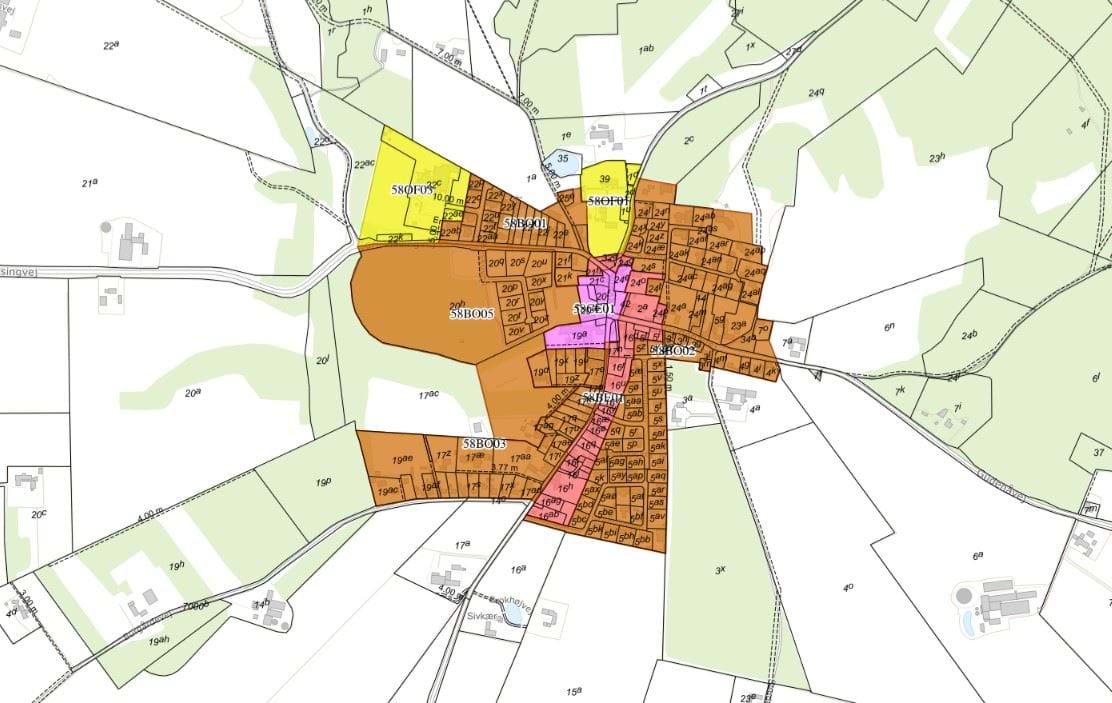 Området på østsiden af Smedegade-Gl. Ryevej er udlagt til blandet bolig og erhverv. Vestsiden er udlagt til centerområde. Området omkring daginstitutionen, fælleshuset og kirken er udlagt til offentlige formål. De øvrige dele af byen og det ubebyggede område syd for Sdr. Vissingvej er udlagt til boligeområde.