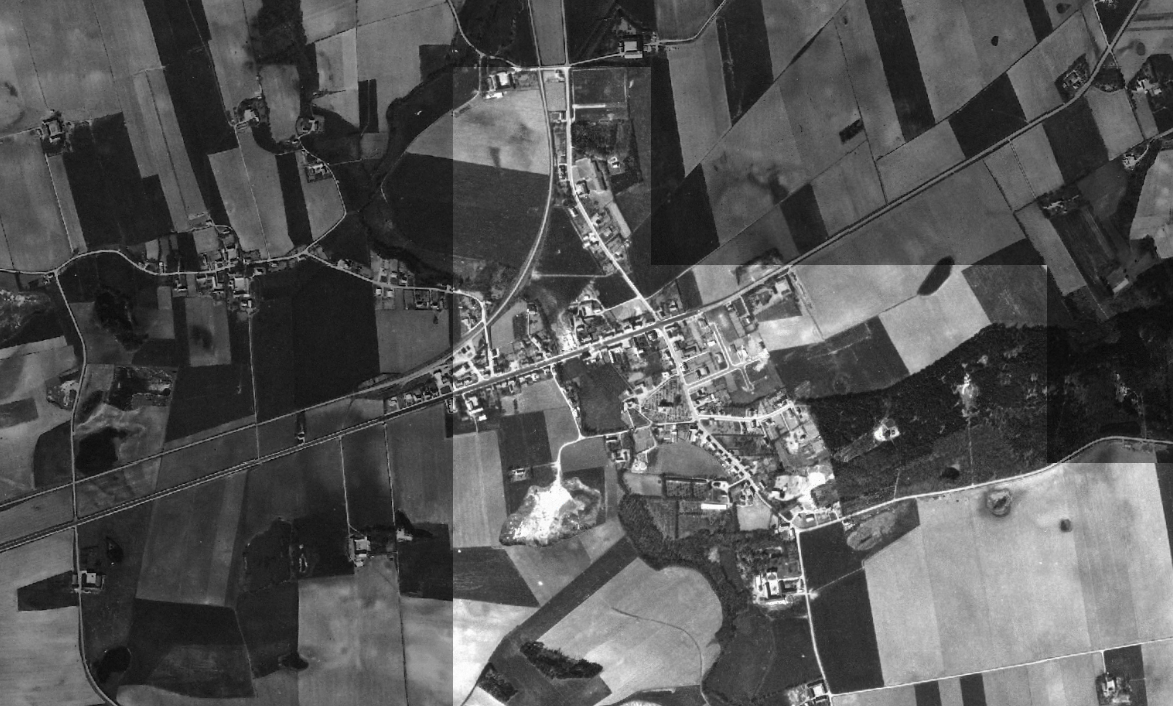 De to kort og luftfoto fra 1965 herover viser hvordan bækken, og engene omkring den, naturligt har opdelt byen gennem dens udvikling. De viser også hvordan byens centrum er fastholdt omkring vejkrydset, med skolen som et nyt tyngdepunkt efter 2. verdenskrig. I 1965 er det første villakvarter ved at blive anlagt.