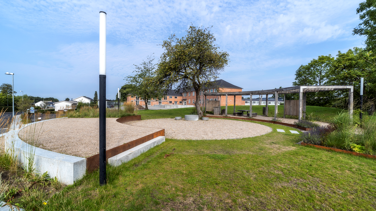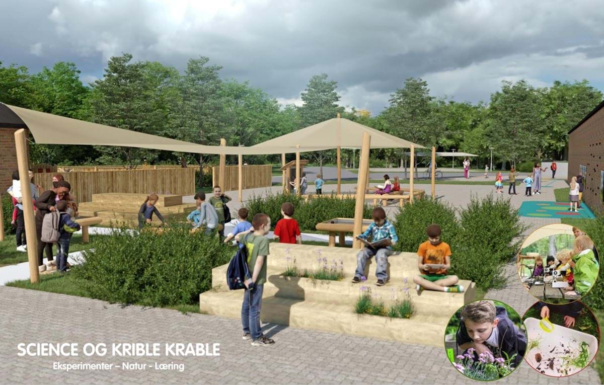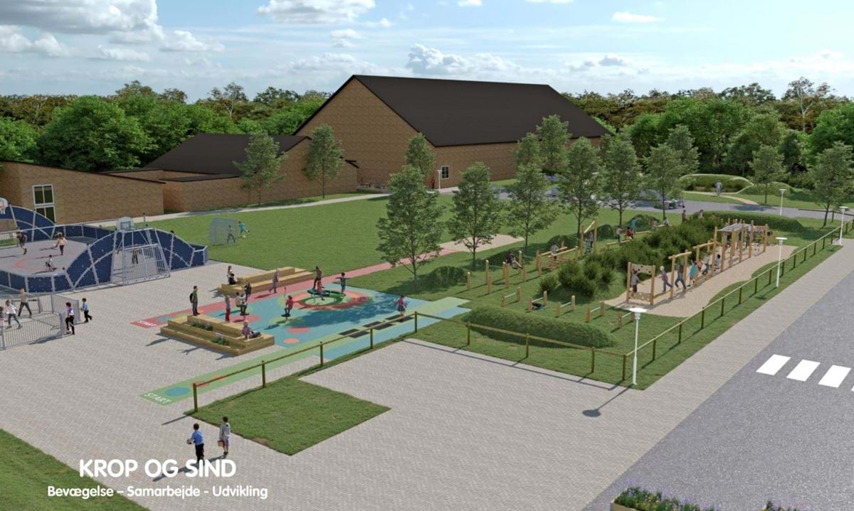 1. Inspirationsbillede fra områdefornyelse i Brædstrup. 2 og 3. Digitale tegninger fra aktuelt projekt til nyindretning af skolegården udført af Kompan.