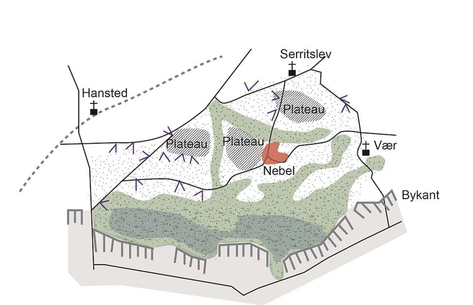 Området som helhed fremstår som overvejende dyrket land med ældre landbrugs- og beboelsesbygninger, forbundet af smalle veje. Nordre Strandvej snor sig gennem bakkelandskabet, nogle af de øvrige veje er relativt rette og stedvis stejle. Nebel er en samling af huse og gårde og en kirketomt. Den øvrige bebyggelse i området er fritliggende gårde og huse, hvoraf mange ligger nær Nordre Strandvej og på den vestlige af de tre plateauer samt langs vejen vest for Serridslev. Der er ingen beboelsesbygninger med en placering eller udformning, der virker dominerende. Store arealer er ubebyggede. Vær med kirke og præstegård danner en særlig kulturhistorisk enklave. Serridslev med kirken fremstår fra vest som en landsby med mange store træer og en klar afgrænsning mod det åbne land. Den vestlige del af området rummer blandet bebyggelse langs Højbovej og Egebjergvej. Der er ikke naturlige eller kulturhistoriske forhold der har givet anledning til ensartethed, og området er derfor generelt varieret i sin bebyggelses- og vejstruktur.