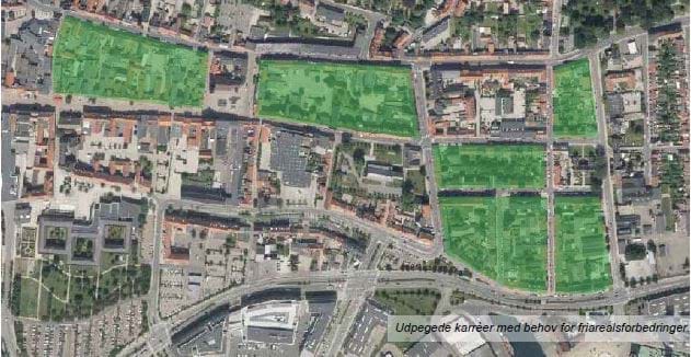 De udpeget karréer, der bliver set på med henblik på at etablere bedre friarealer. Karréerne er markeret med grønt på nedenstående luftfoto.
